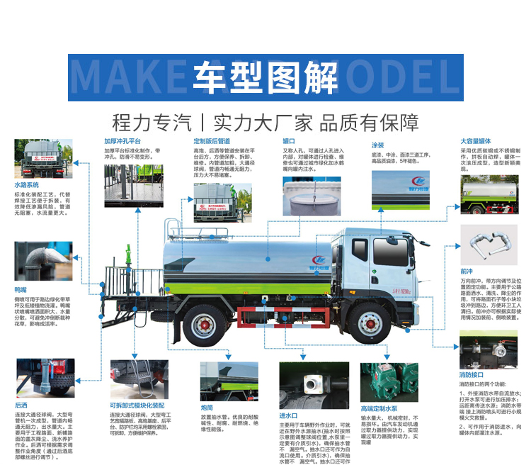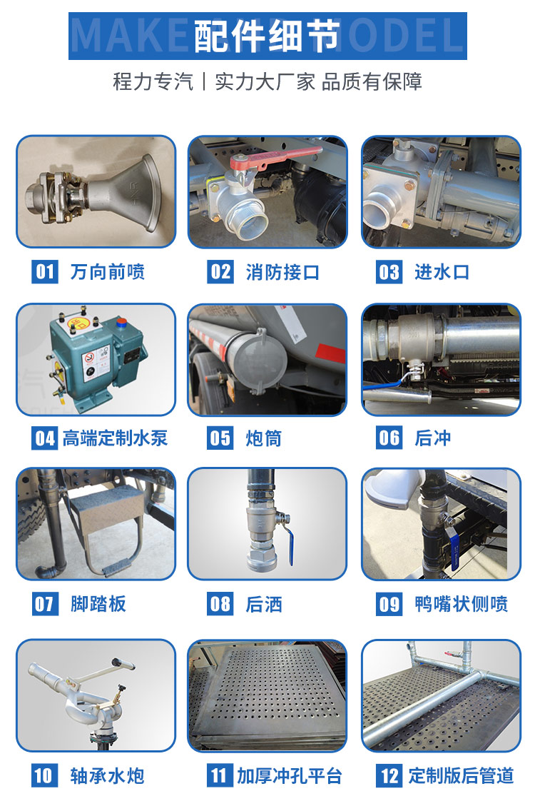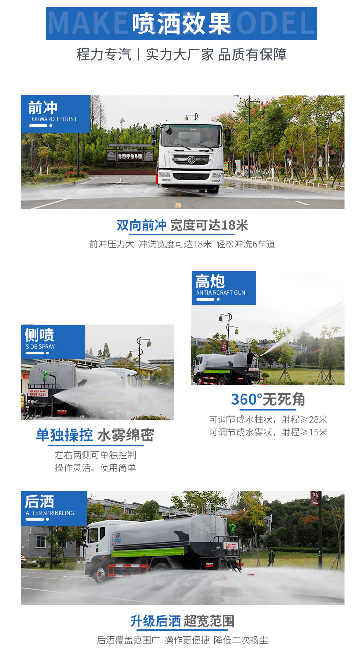 【选装配置】20米绿化卷盘或药泵,气动阀控制喷洒球阀,低水位报警,LED大号箭头灯,罐内防腐,罐体保温,不锈钢管道、球阀、洒水泵、洒水炮、罐体。