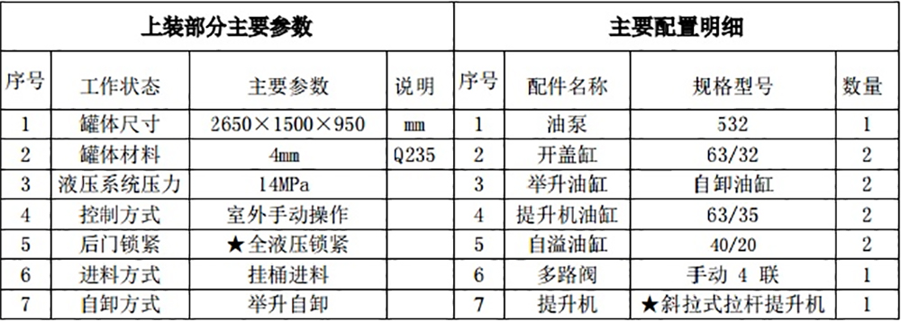罐体采用优质碳钢板材,罐体内部带固液分离功能(全推推板,不锈钢泔水分离网板),罐内加热功能(用于严寒地带防止罐内餐饮垃圾冻结凝固,采用柴油燃烧机加热,加热速度快效果好,可设置高低温实现自动温控)全液压操