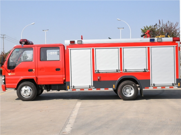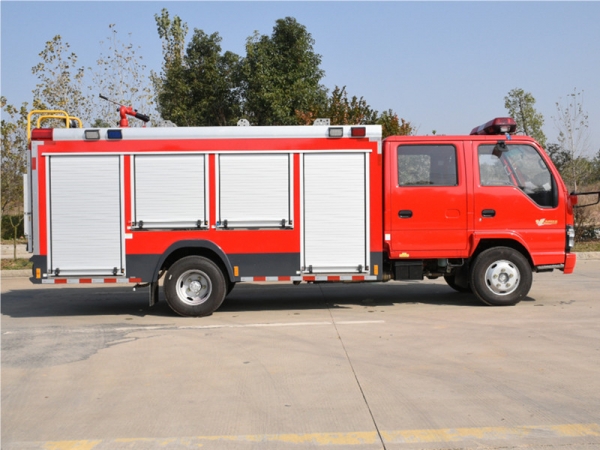 电气配置 | 驾驶室顶部前端为长排100W警报器及警灯,车身后配有24V/60W火场照明灯一只,车辆两侧上方各配有红蓝相配的爆闪灯,下方安装安全标志灯,乘员室、器材箱、 泵房内均装有照明灯,回转警灯开关、通讯设备预备接口。 |