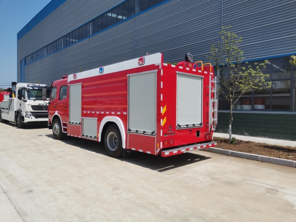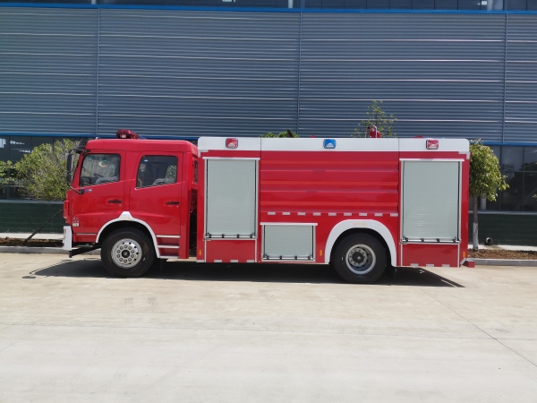 电气配置 | 驾驶室顶部前端为长排100W警报器及警灯,车身后配有24V/60W火场照明灯一只,车辆两侧上方各配有红蓝相配的爆闪灯,下方安装安全标志灯,乘员室、器材箱、 泵房内均装有照明灯,回转警灯开关、通讯设备预备接口。 |