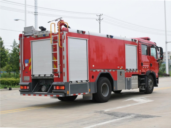 电气配置 | 驾驶室顶部前端为长排100W警报器及警灯,车身后配有24V/60W火场照明灯一只,车辆两侧上方各配有红蓝相配的爆闪灯,下方安装安全标志灯,乘员室、器材箱、 泵房内均装有照明灯,回转警灯开关、通讯设备预备接口。 |