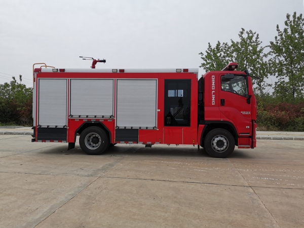 电气配置 | 驾驶室顶部前端为长排100W警报器及警灯,车身后配有24V/60W火场照明灯一只,车辆两侧上方各配有红蓝相配的爆闪灯,下方安装安全标志灯,乘员室、器材箱、 泵房内均装有照明灯,回转警灯开关、通讯设备预备接口。 |
