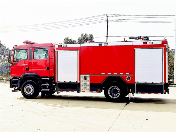 电气配置 | 驾驶室顶部前端为长排100W警报器及警灯,车身后配有24V/60W火场照明灯一只,车辆两侧上方各配有红蓝相配的爆闪灯,下方安装安全标志灯,乘员室、器材箱、 泵房内均装有照明灯,回转警灯开关、通讯设备预备接口。 |