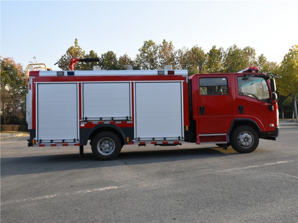 电气配置 | 驾驶室顶部前端为长排100W警报器及警灯,车身后配有24V/60W火场照明灯一只,车辆两侧上方各配有红蓝相配的爆闪灯,下方安装安全标志灯,乘员室、器材箱、 泵房内均装有照明灯,回转警灯开关、通讯设备预备接口。 |