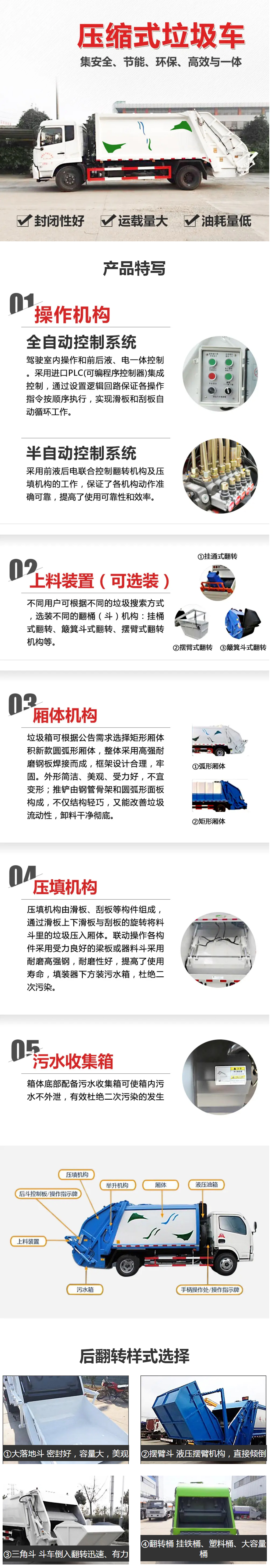 标配:箱体满焊,尾部带照明灯,方便夜间操作使用。标配240L挂桶翻转机构。