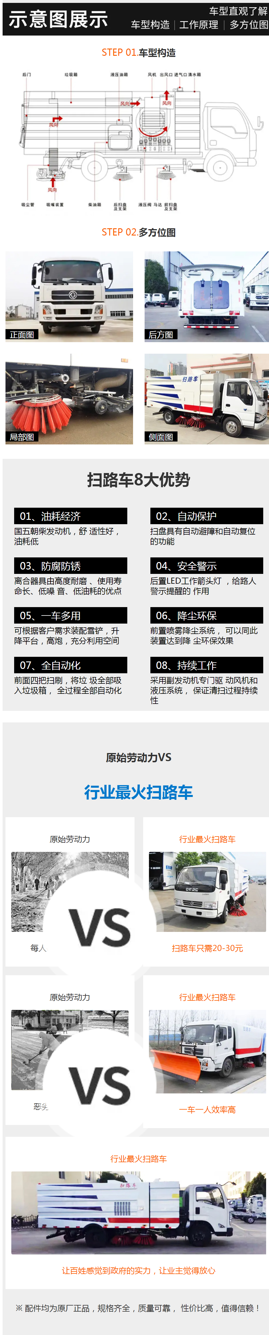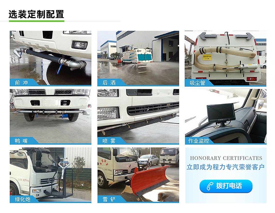 带扫盘4把,江铃副发动机;大力马达;施耐德控件开关;台湾电磁阀组;免维护自分离式离合器;免维护风机;不锈钢水箱;不锈钢垃圾箱;尾部LED箭头灯;手动泵应急系统;刷臂转动机构使用高新耐磨工程隔套,免打黄油;精密冷弯无缝液压油管。