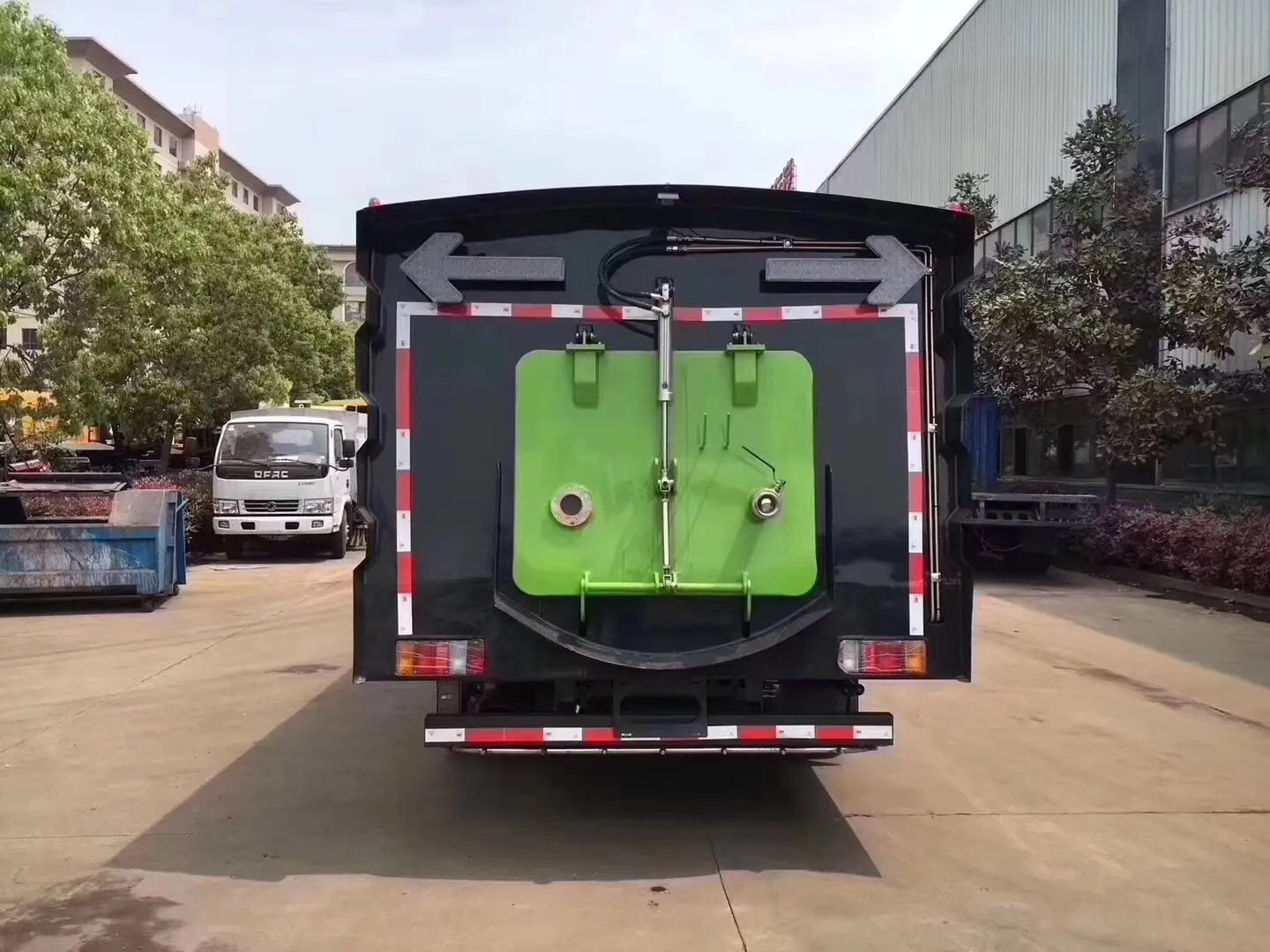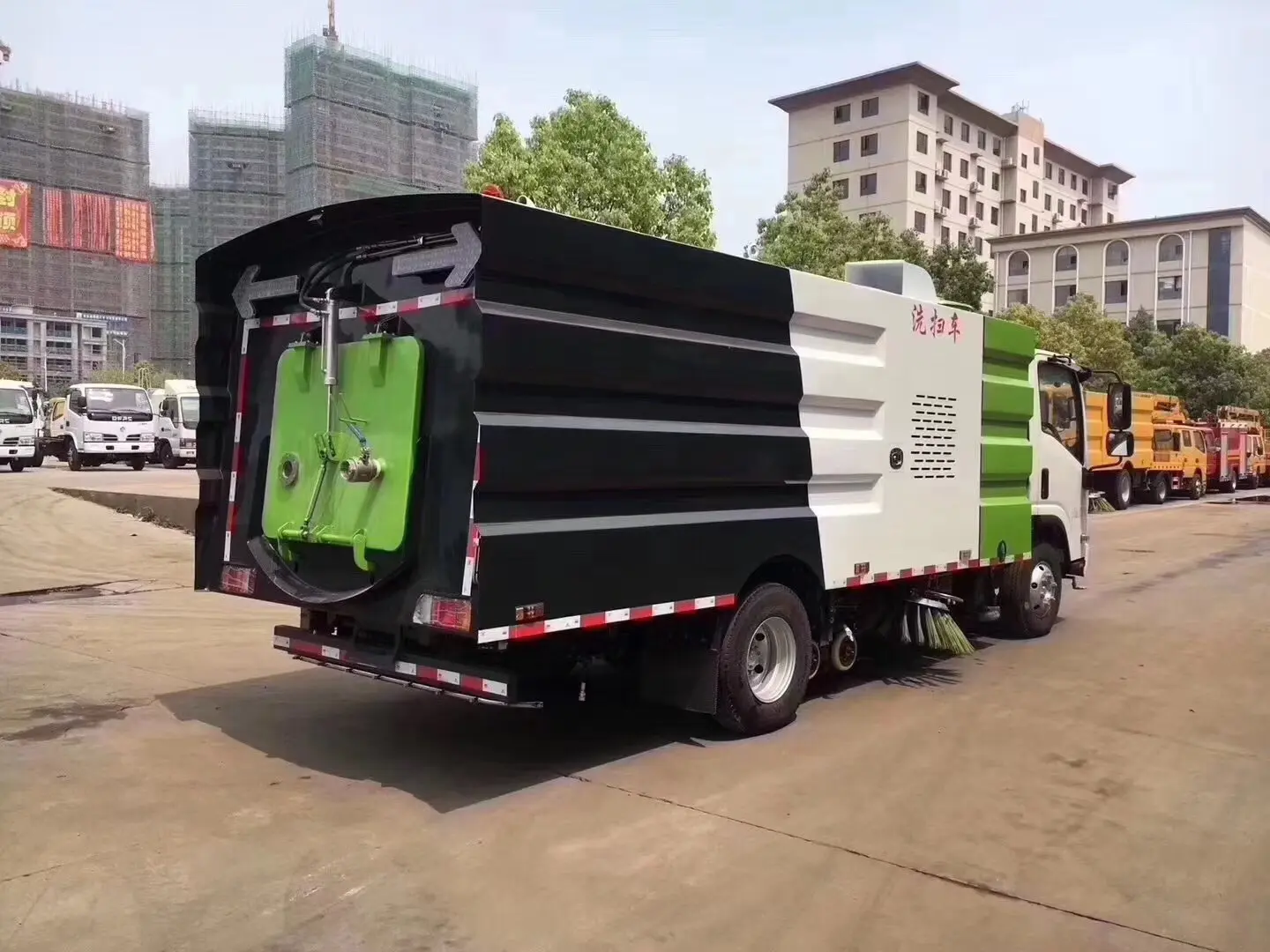 上装配置:副发动机是康明斯140马力,箱体材质为304不锈钢,垃圾箱容积4.5立方,清水箱容积5立方,清扫宽度:2800-3200mm,保洁作业速度15-20km/h, 最大清扫能力48000㎡/h , 德国进口高压泵(前冲/侧喷/中喷/后喷雾/冲洗水枪/垃圾箱自洁装置),水过滤器,管路,不锈钢喷架,高压喷嘴,清吸降尘左右前扫盘,吸尘吸盘,带2个中置扫盘,LPC电子控制,一键操作,尾部厢体外观为方形豪华型,日本三洋马达;万向高压路沿清洗喷头,威龙低压泵(前冲);不锈钢管高压管路;德国控制器, PLC一键控制;尾部LED箭头灯;副机转速表、副机水温表、机油温度报警装置、各种操作控制开关;倒车及洗扫状态室内监视器。18m高压冲洗卷盘。清洗压力10MPa;吸入颗粒度:≥100mm。