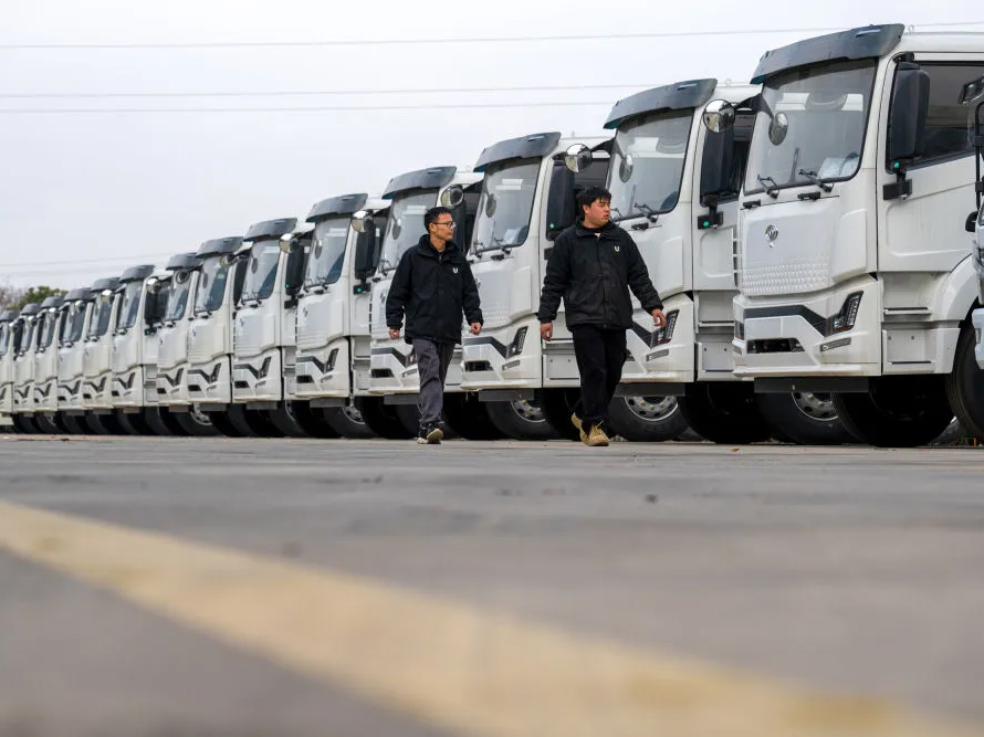 工作人员在湖北程力集团下线的成品车前巡查。新华社记者肖艺九 摄