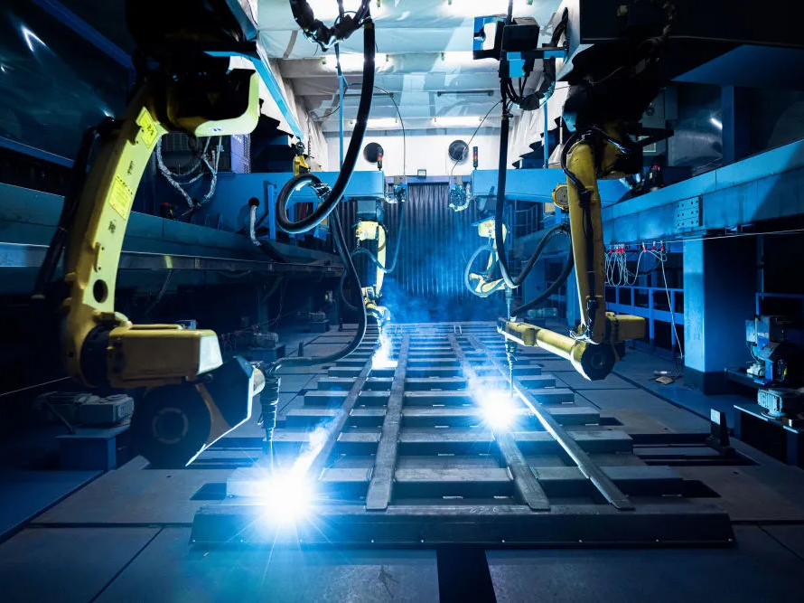 工业机器人在中国重汽集团湖北华威专用汽车有限公司自卸车智能化生产线上作业。新华社记者肖艺九 摄