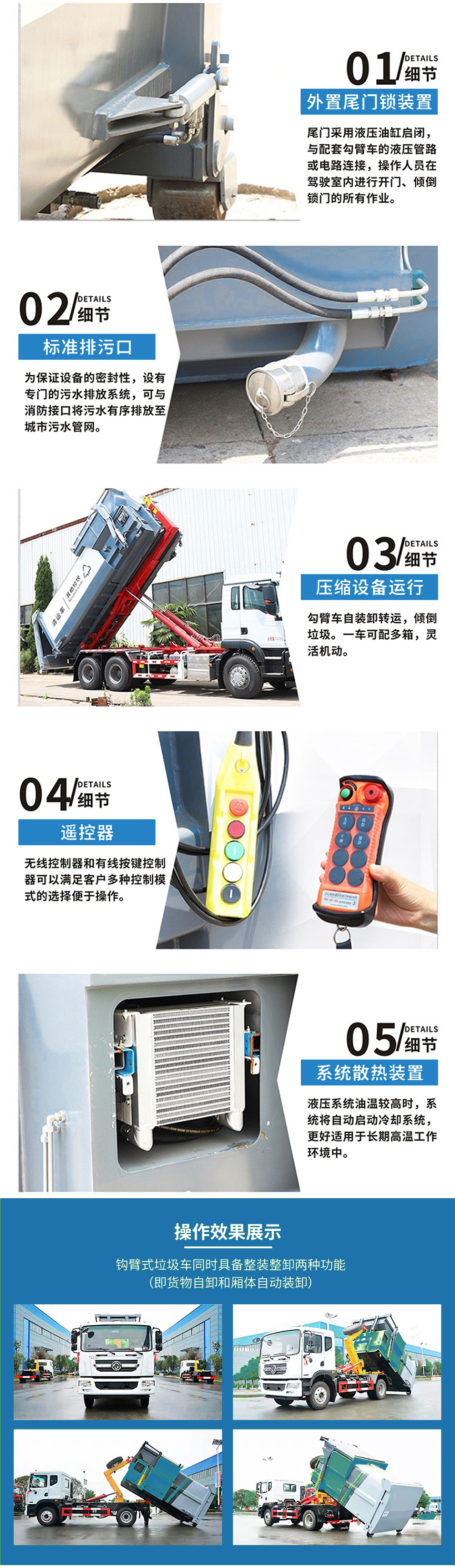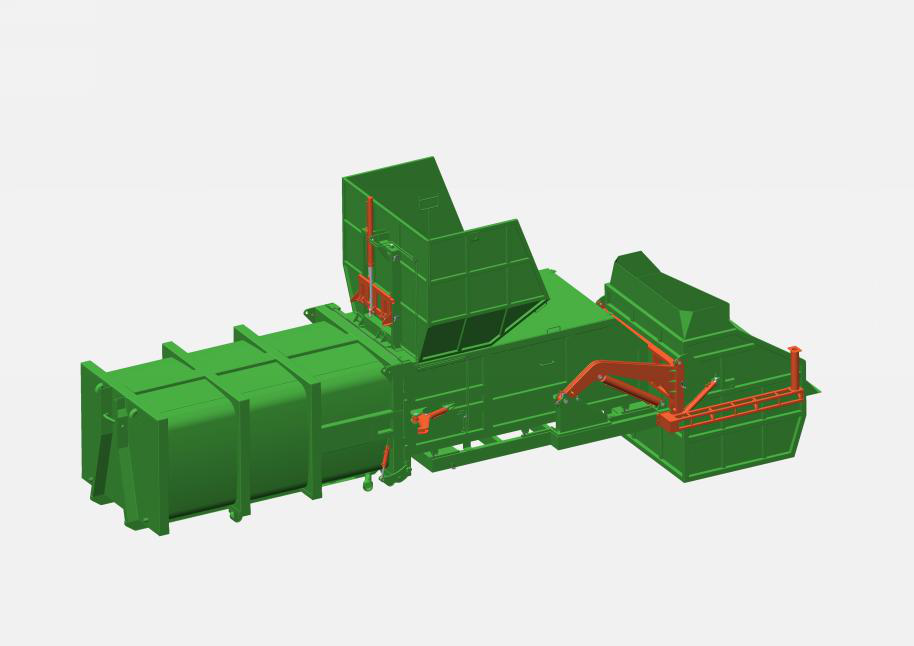 主机箱体包含:主机箱体、压缩仓、压头、压缩油缸、滑轮、液压系统、电控系统等组成。其主要结构件采用Q345高强度结构钢焊接成成,具有较有的耐磨性;主机箱体上的滑轮与滑台导轨配合,使主机能相对滑台滑动,液压电控系统固定安装于主机箱体上,整体简洁美观。箱体容积15m³,匹配16吨后双桥车厢可卸式垃圾车。