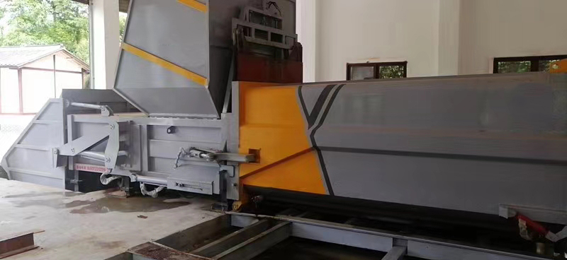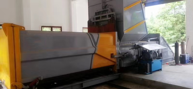 主机箱体包含:主机箱体、压缩仓、压头、压缩油缸、滑轮、液压系统、电控系统等组成。其主要结构件采用Q345高强度结构钢焊接成成,具有较有的耐磨性;主机箱体上的滑轮与滑台导轨配合,使主机能相对滑台滑动,液压电控系统固定安装于主机箱体上,整体简洁美观。箱体容积18m³,匹配20吨后双桥车厢可卸式垃圾车。